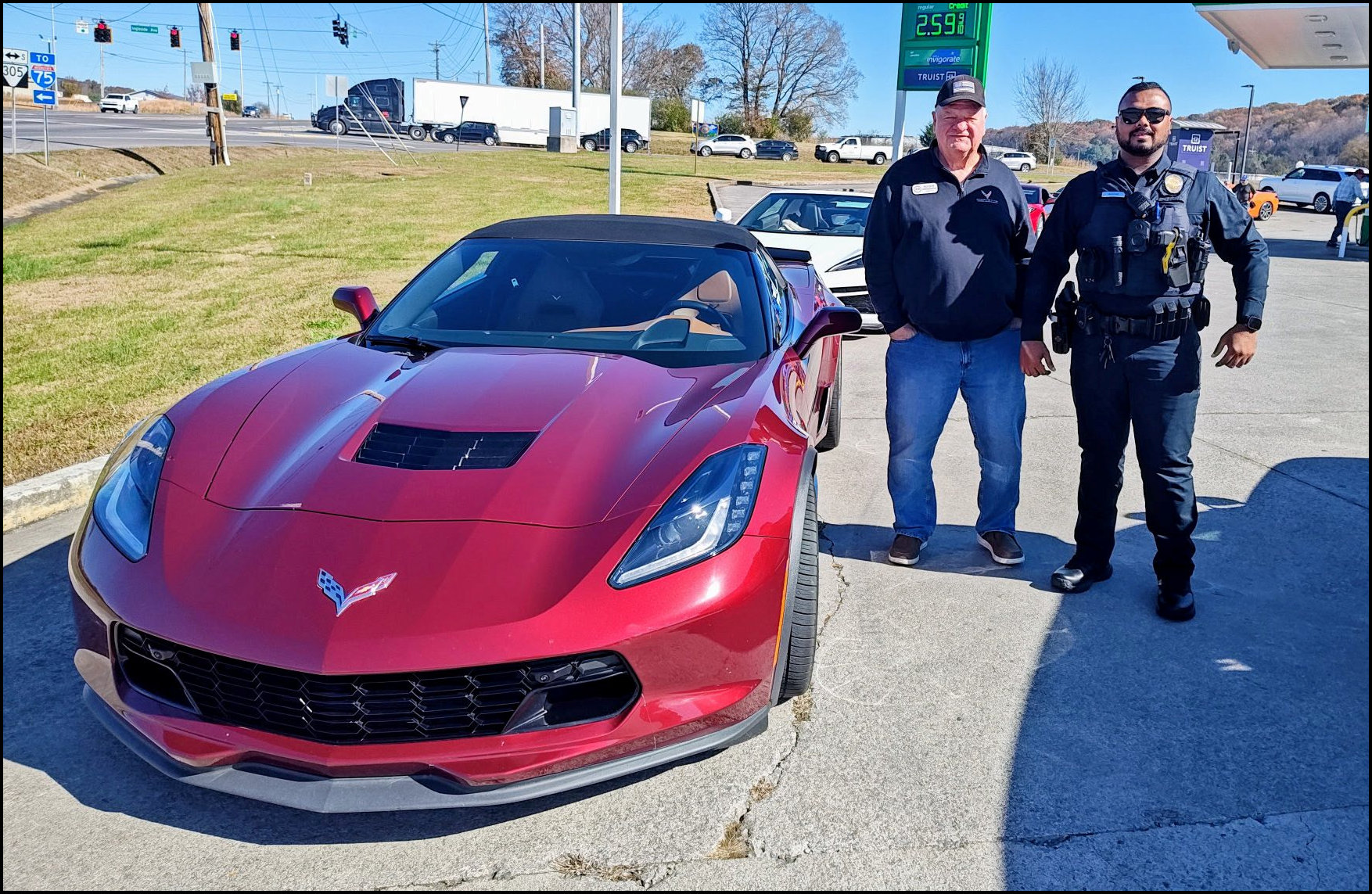 We started with a gorgeous drive through the countryside, winding over hills and dipping through valleys, soaking in every scenic mile. Just before our first stop to stretch our legs and take a quick break, we noticed a police officer trailing behind our last car—maybe he was a Corvette fan, or maybe he was just curious to see if one of us would let loose with a roar of adrenaline! Either way, when we pulled in, he did too—and instead of a ticket, we got a smile and a great conversation. He walked the line of cars, admiring each one and chatting with the group. It was a reminder of how these cars bring people together—even unexpectedly.