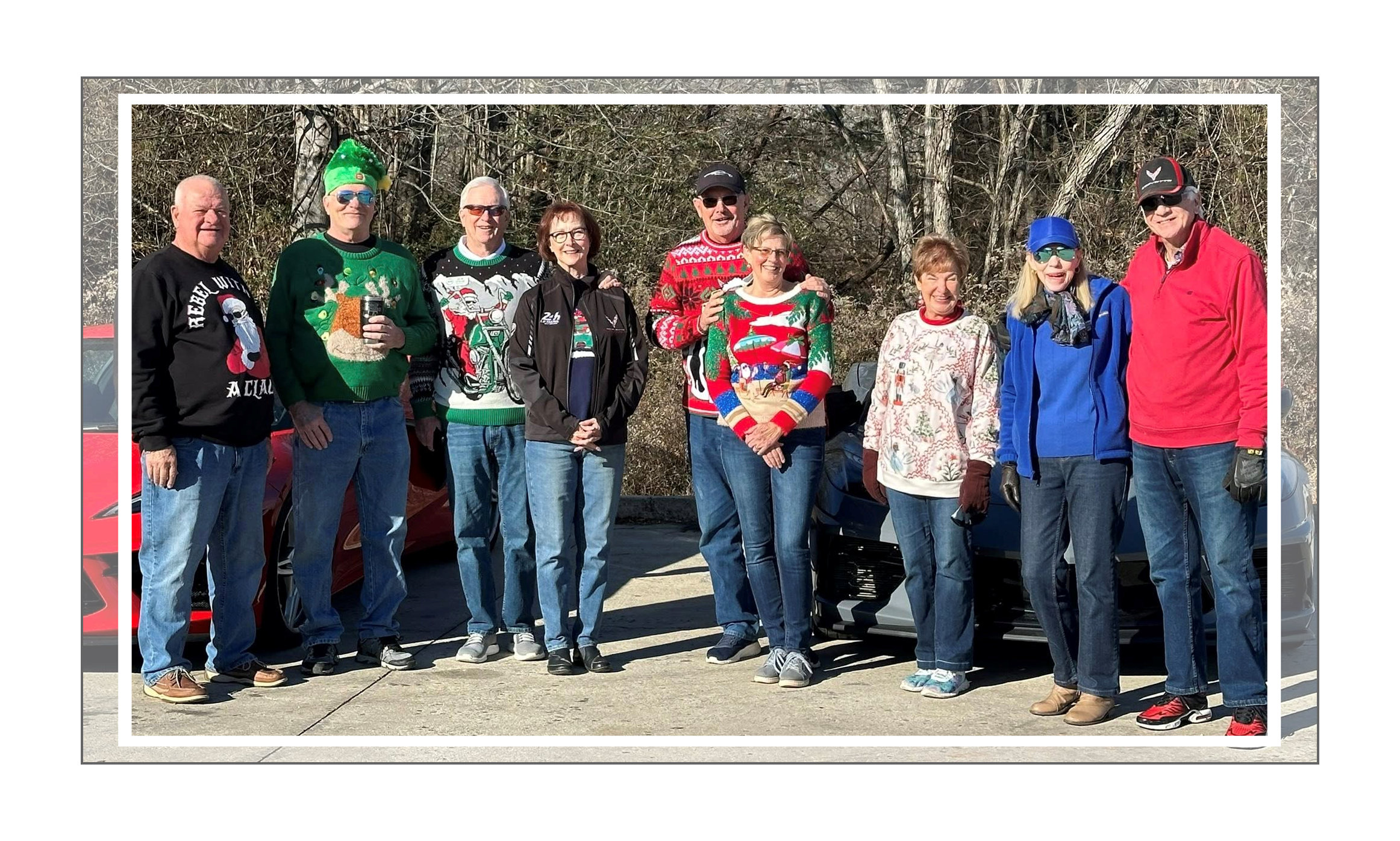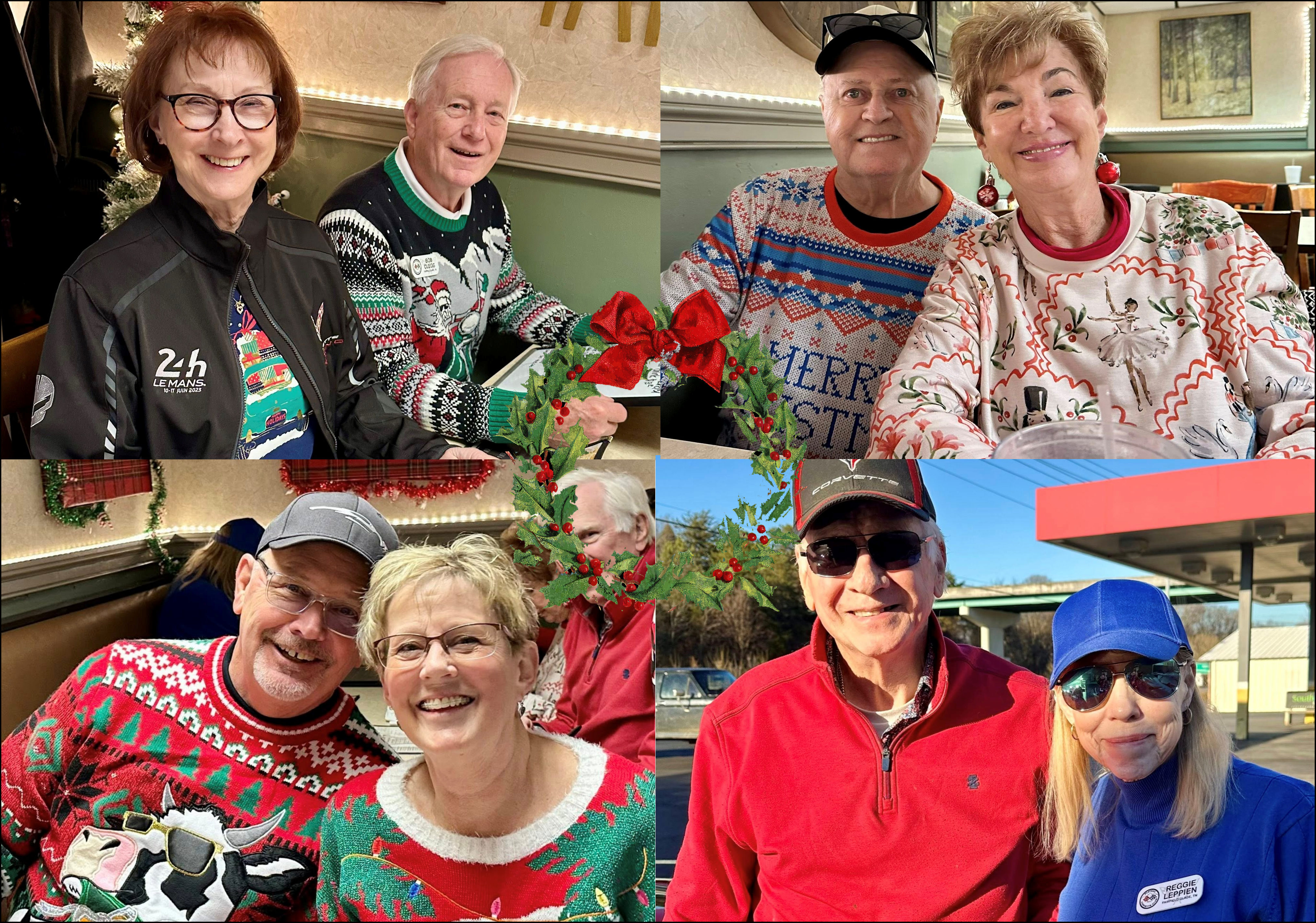 This ride was hosted by Roger and Kathy Johnson. A few surprises as we gathered to meet for the ugly Christmas Sweater ride; Tom showed up with his dancing musical hat that left us all laughing, and 8 sparkling Corvette “sleighs” rolled out under beautiful sunny skies and 40-degree temps! A wonderful way to start the day! Wish you all could be along with us – a day of fun, friends, curves and camaraderie!!