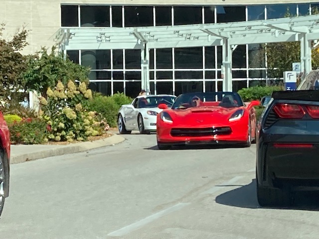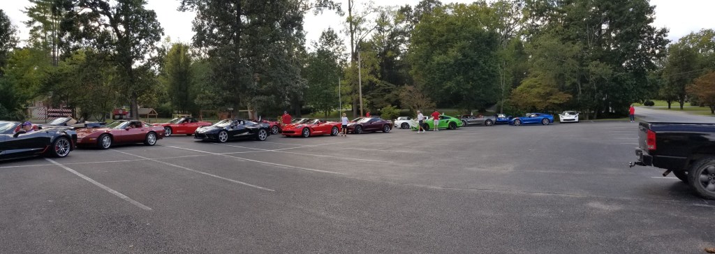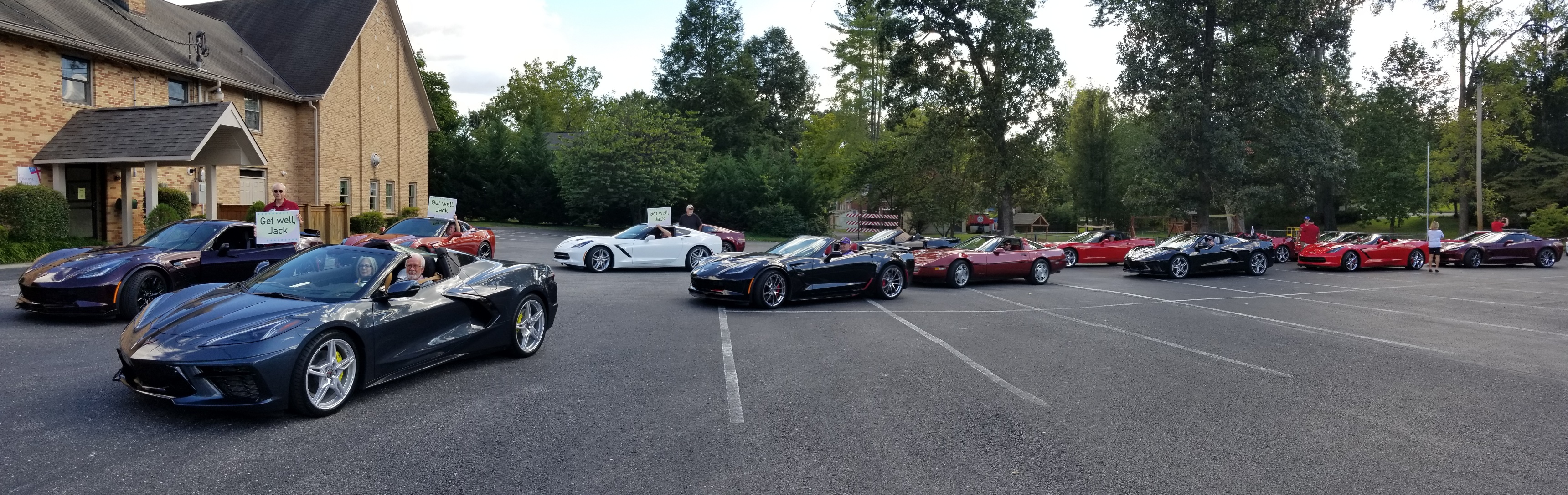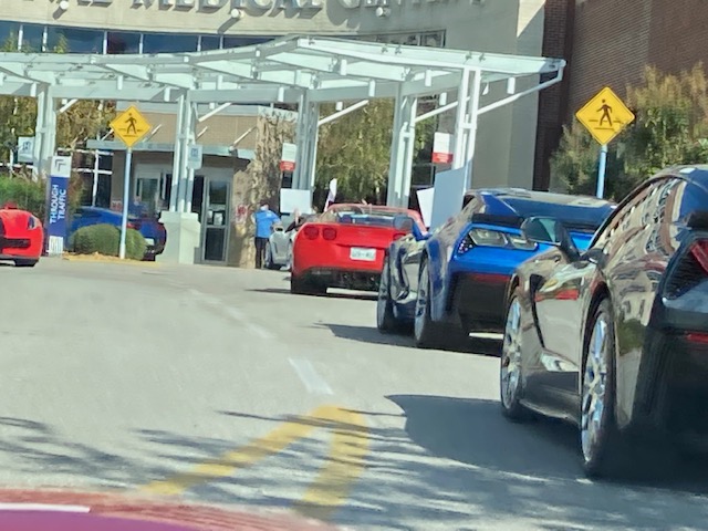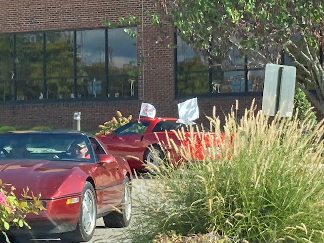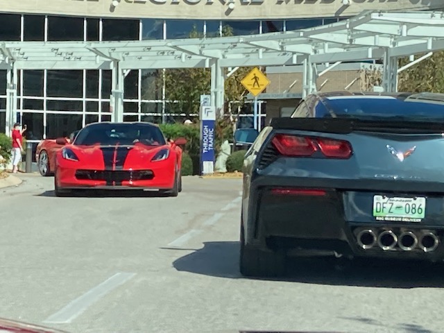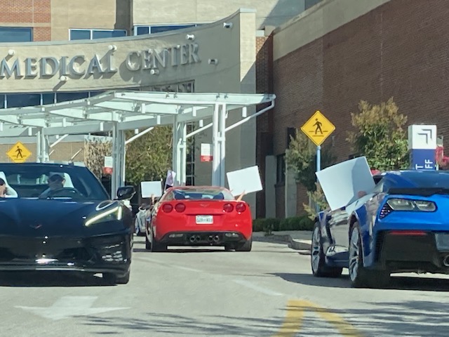 September 9th 28 Corvettes from the Plateau Corvette Club drove to the Cookeville Medical Center to pay a visit to a club member who is recovering in the hospital. The patient was brought outside to view the Corvettes as they paraded past. This brought big smiles to he and his wife. They appreciated the visit. Kathy also assembled a lovely gift basket and a meal from Spankies for them from club members. A big Thank You to Kathy and Roger for arranging the visit and to Frank for having “Get Well” signs made for the members to hold up and for leading the parade. And a Thank You to all club members who attended this event.