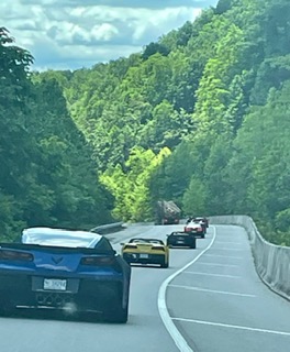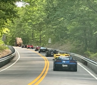 Friday, May 13th was our first ever “Friday the 13th Hooky Cruise” 14 members in 8 Corvettes took the day off, left their work behind, and went out for a curvy cruise along some beautiful Tennessee roads while they played “hooky”. It was a beautiful sunny day, and the roads didn’t let us down. However, as we got to one of our favorite sections of curves along TN 108 (a really nice place to enjoy the road, if you know what I mean) we got behind a fully loaded logging truck who wouldn’t move over OR even do close to the speed limit! It was the consensus of the group that the guy most likely didn’t have brakes and probably shouldn’t have even been out on the road!!!