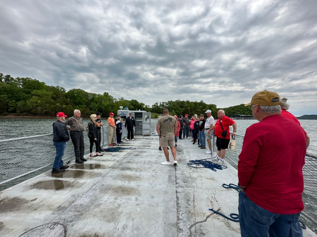 When they arrived at Trooper Island they got to the boat ramp and the ferry awaited for the ride to the island. Everyone parked their cars and boarded ready for transport across the lake.