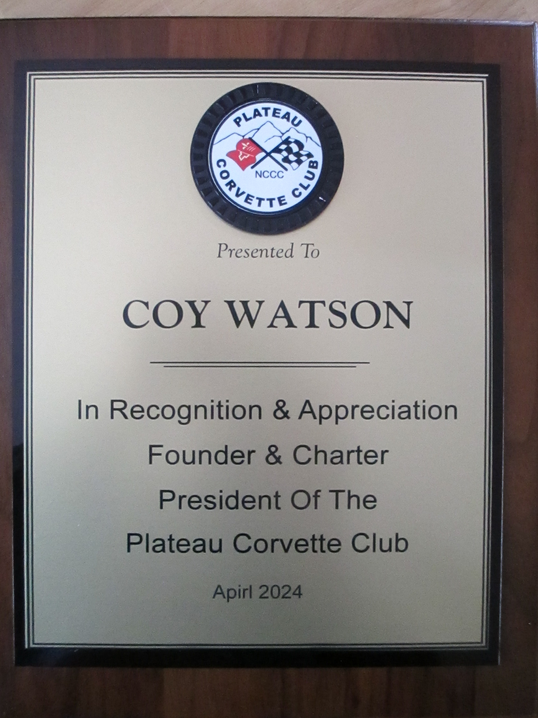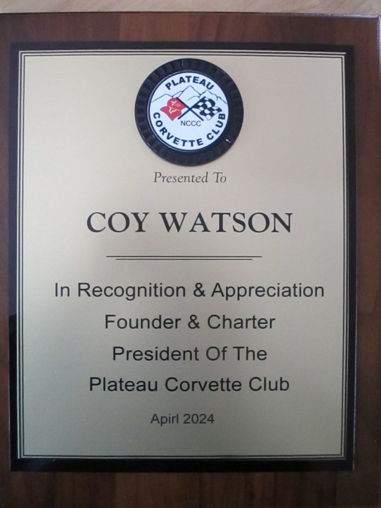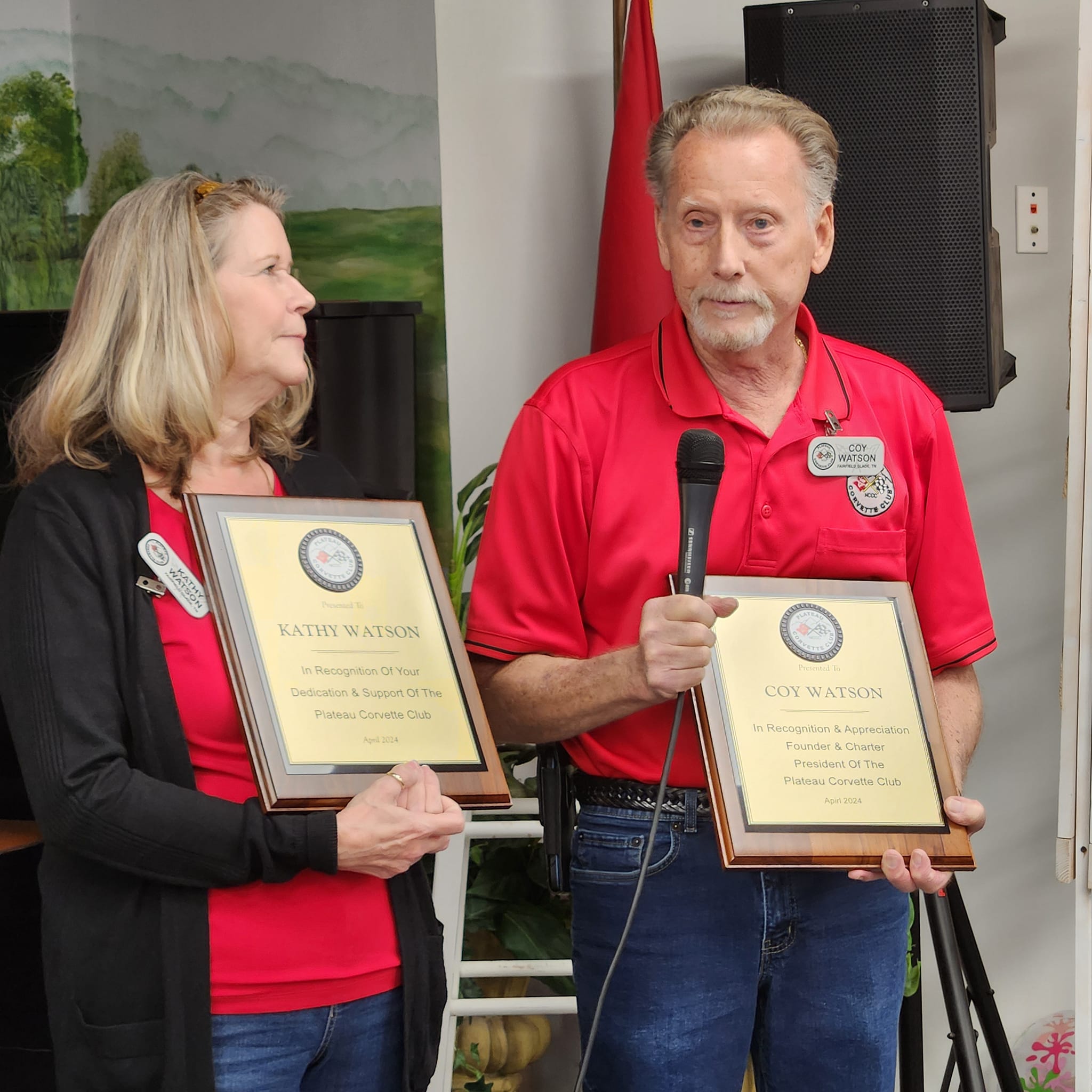 At the April 4 , 2024 meeting Plateau Corvette Club members presented a plaque to our Club Founder and Charter President Coy Watson for starting the Plateau Corvette Club, and to his wife Kathy for her dedication and support of the club. Coy and Kathy are moving from the Crossville area and will be missed. In 2011 Coy had noticed a great number of Corvettes in the Fairfield Glade area and decided to try and start a club in Crossville. On November 3rd 2011 he gathered a group of Corvette owners at Dave Kirk Automotive to see if a club would be supported. To his surprise he had a large group show up, and today we have 140 members. Thank You Coy and Kathy!!