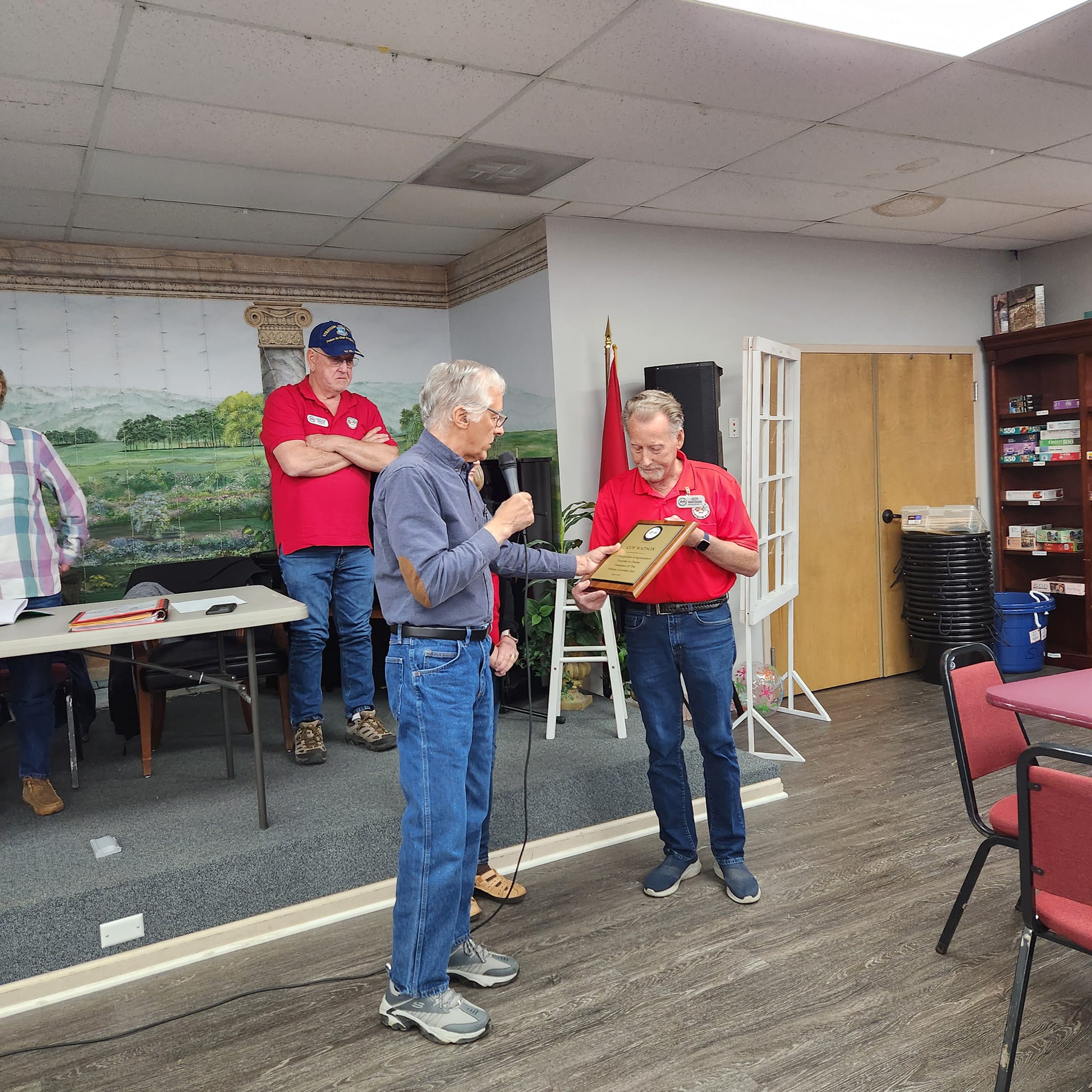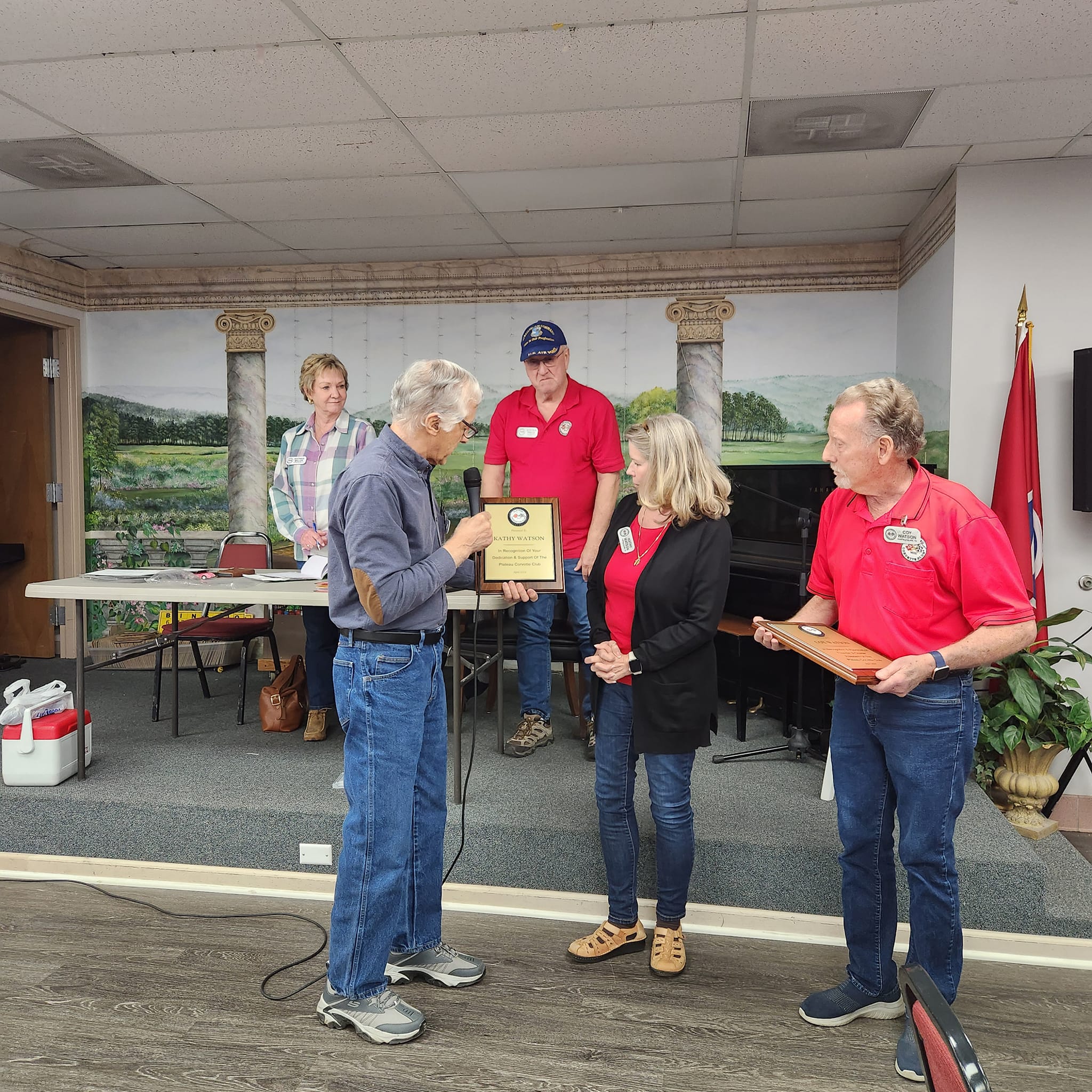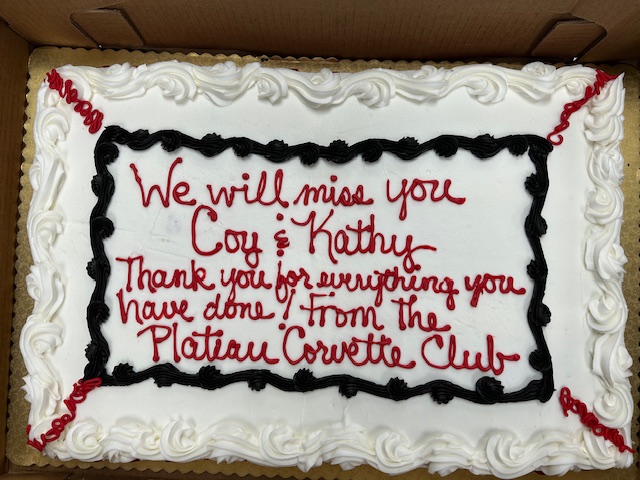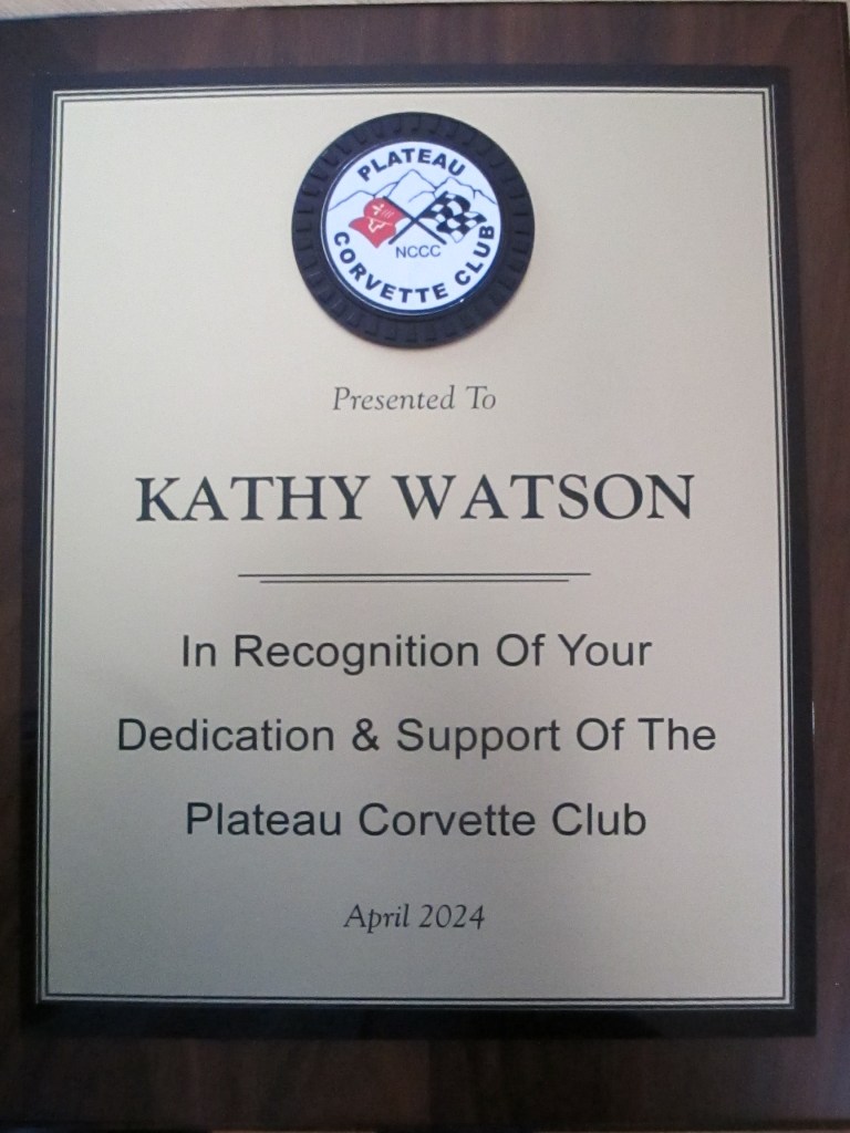 At the April 4 , 2024 meeting Plateau Corvette Club members presented a plaque to our Club Founder and Charter President Coy Watson for starting the Plateau Corvette Club, and to his wife Kathy for her dedication and support of the club. Coy and Kathy are moving from the Crossville area and will be missed. In 2011 Coy had noticed a great number of Corvettes in the Fairfield Glade area and decided to try and start a club in Crossville. On November 3rd 2011 he gathered a group of Corvette owners at Dave Kirk Automotive to see if a club would be supported. To his surprise he had a large group show up, and today we have 140 members. Thank You Coy and Kathy!!