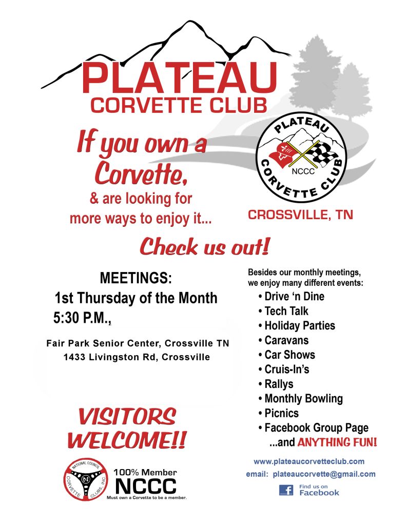 The Plateau Corvette Club is now meeting in the Fair Park Senior Center, 1433 Livingston Rd, Crossville, Tennessee 38555
